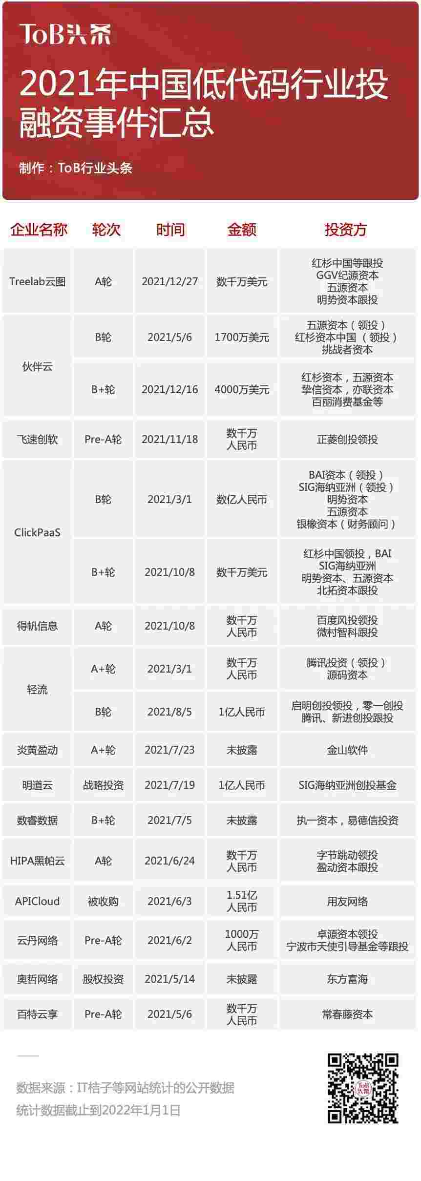 到2021年,,无/低代码投融资规模势头更甚,,,,其中包括轻流两轮融资(A+轮数千万人民币,,,B轮近亿人民币)、、美团钱包商家版 两轮融资(B轮数亿人民币,,,,B+轮数千万美元)、、百特云享数千万元Pre-A轮融资......